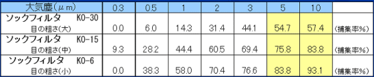 ※一般的に食品工場で問題になる落下菌は5.0〜15μmのチリ・埃等に付着して浮遊しており、このサイズのチリ・埃を捕捉することにより落下菌は大幅に減少します。
